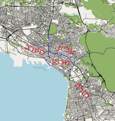 את מפת סלוניקי ניתן לחלק לשלושה אזורים: מרכז, מערב ומזרח, כשלכל אזור ישנו חלק עליון וחלק תחתון.
